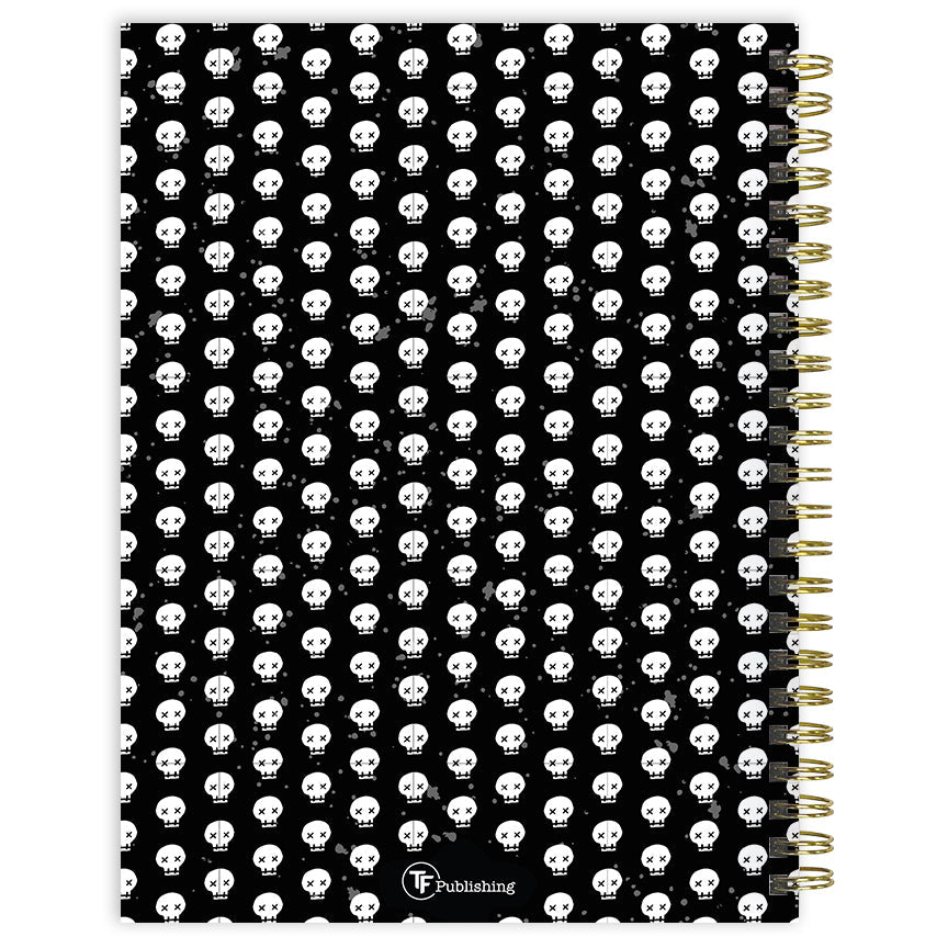 Channel your inner goth with our medium weekly monthly planner featuring a modern skull cover design! Measuring 6.5" (w) x 8" (h), the all-encompassing planner boasts 2-page monthly spreads that include lined sections for notes, tasks, and goals and 2-page weekly spreads with lined daily sections to keep plans neat and organized. Plus, a dedicated weekly priorities section to help you stay focused! The interior pages are designed with a dark and moody feel, accented with faux monthly tabs for easy access to weekly planning. Enhance your daily plans with 216 color coordinating stickers to highlight special occasions and personalize your planner. Bonus lined notes pages are in the back with yearly 2026 and 2027 views in the front. The monthly boxes measure .75" (w) x 1.25" (h). Featuring a durable cover and gold wire-o binding designed to lay flat when open, this 12-month planner covers January 2026 – December 2026 and includes a plastic free cover and is fully recyclable! Printed on FSC-certified paper.