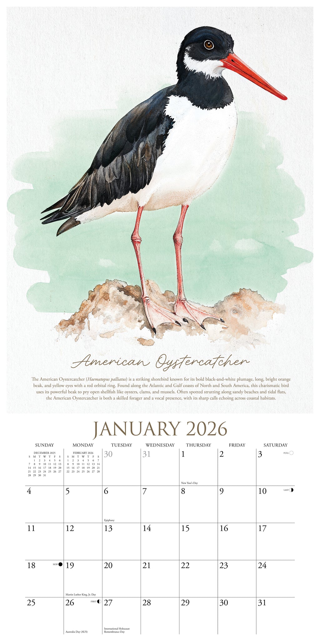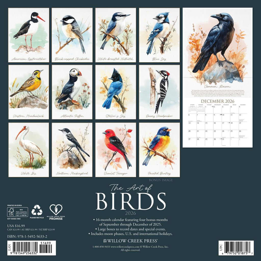 Celebrate the graceful beauty of birds through exquisite artwork, featuring vibrant illustrations and detailed renderings of avian species each month.