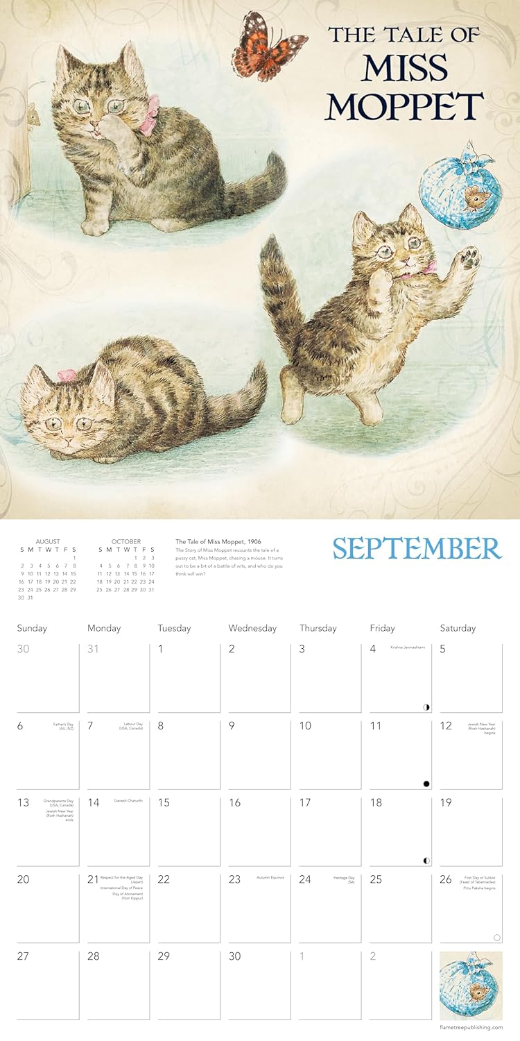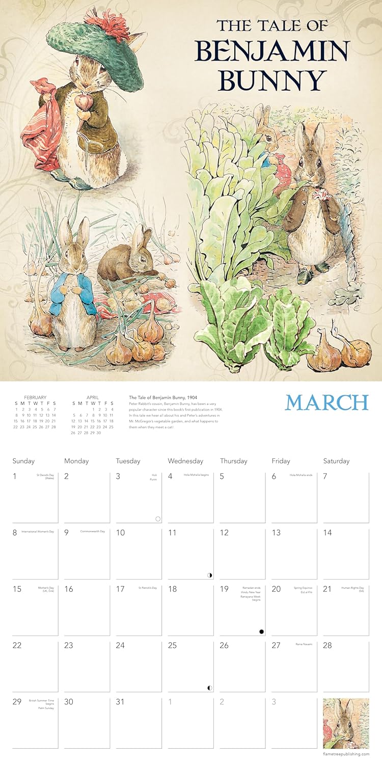 Produced in collaboration with the official World of Peter Rabbit brand, this beautiful wall calendar features original artwork from many of Beatrix Potter's classic tales, including such iconic characters as Peter Rabbit, Mrs. Tiggy-Winkle, Squirrel Nutkin, Tom Kitten, Mr. Jeremy Fisher and many more. Informative text accompanies each work and the datepad features previous and next month’s views. Printed on FSC-certified paper, with plastic-free packaging.