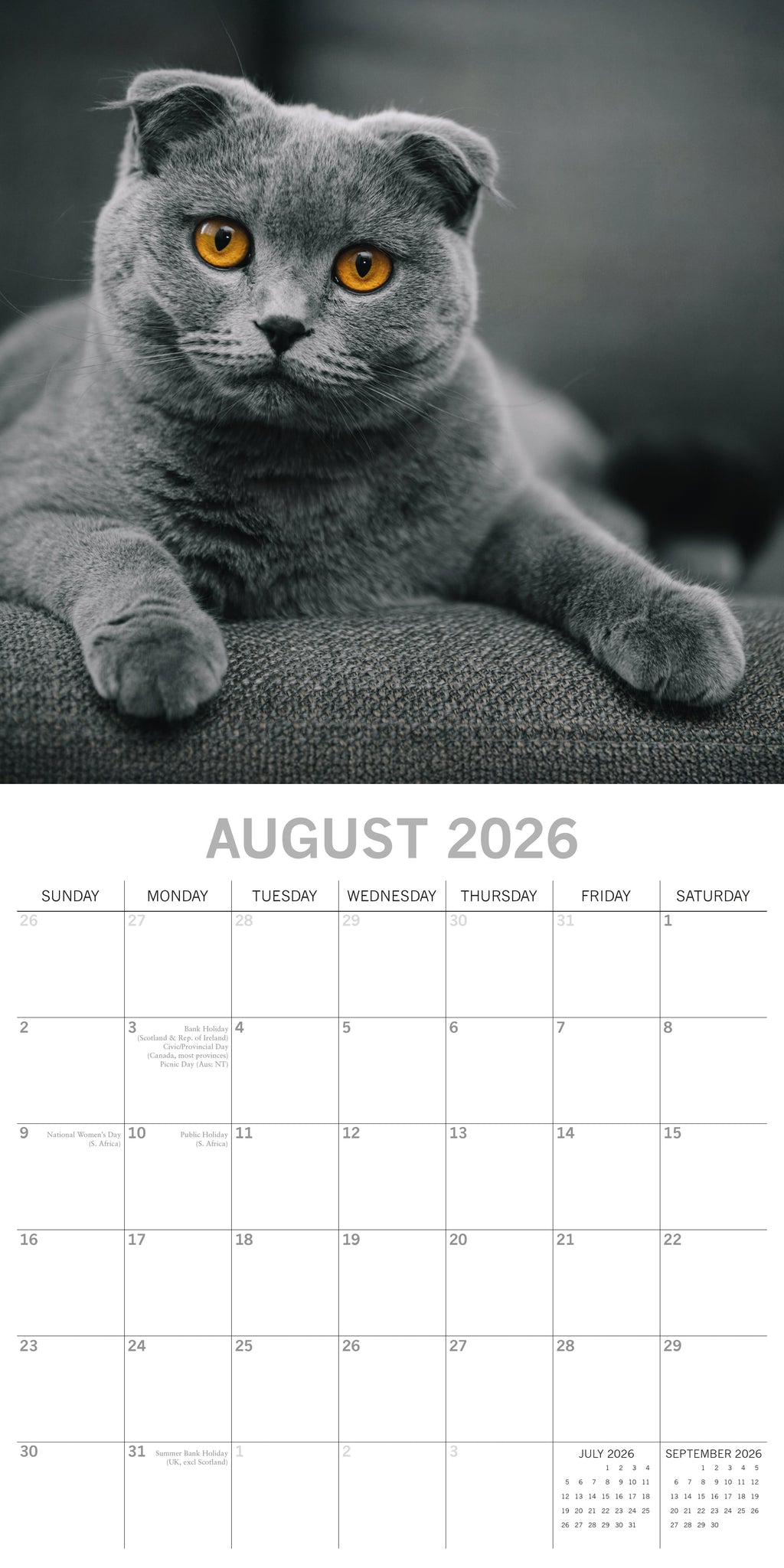 The 2026 Top Cats Square Wall Calendar spans 16 months—from September 2025 through December 2026—with the final four months of 2025 presented in a compact, mini-grid format. Each monthly spread begins on Sunday, with the top half showcasing a beautiful image and the bottom half featuring an easy-to-read monthly layout. The calendar comes shrink-wrapped for protection. .