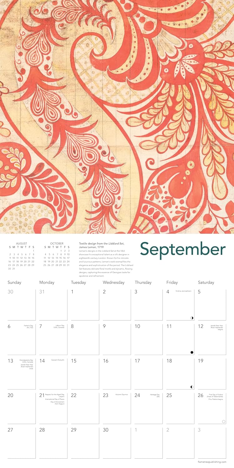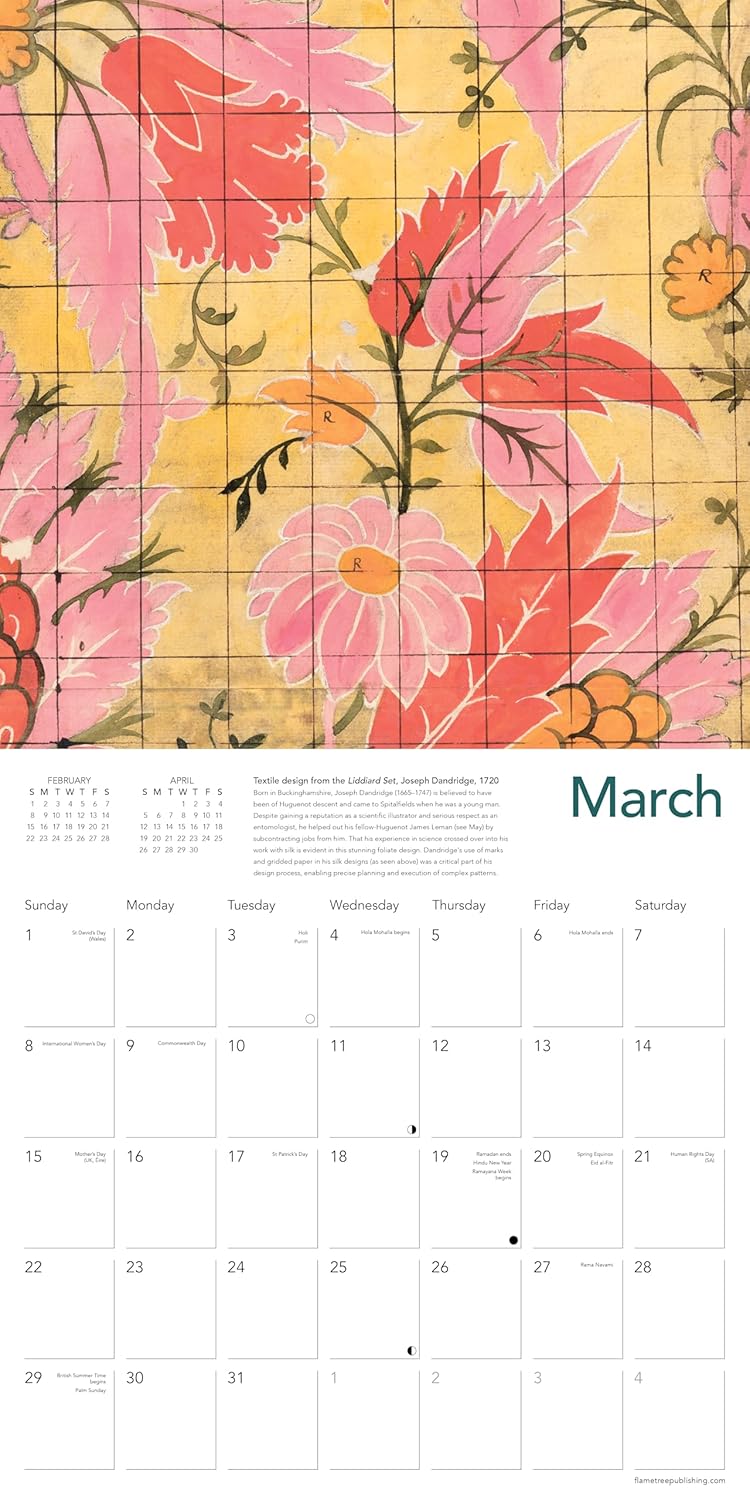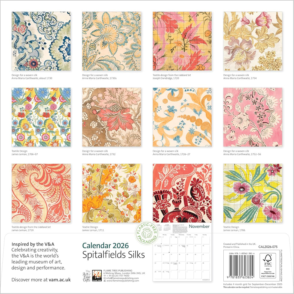 The eighteenth century was a particularly distinctive period in the history of British design, marked by the rise of the Spitalfields silk industry in London’s East End. Anna Maria Garthwaite, James Leman and Joseph Dandridge are among the names closely associated with this period, thanks to the survival of their exquisite watercolour designs now held in the V&A collection. This vibrant selection of patterns illustrates their keen interest in natural forms and exceptional skill in depicting them. Informative text accompanies each work and the datepad features previous and next month’s views. Printed on FSC-certified paper, with plastic-free packaging.
