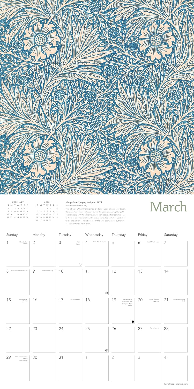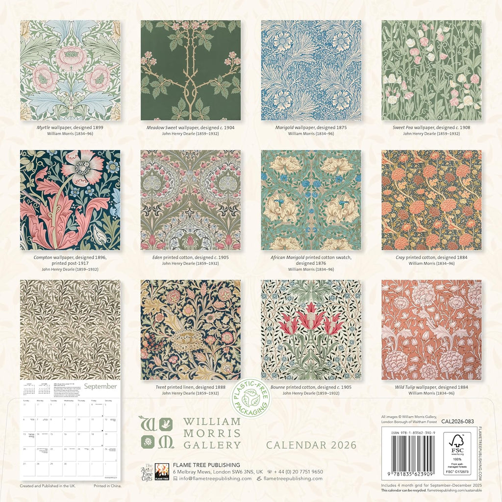 William Morris was a renowned artist, textile designer and activist. A pioneer of the Arts and Crafts Movement, his work remains as popular today as ever. Featuring 12 celebrated designs from the collection of the William Morris Gallery, this calendar showcases the beauty and flair of the original Morris & Co. aesthetic, featuring a selection of wallpapers and fabrics designed by Morris himself, as well as renowned colleagues and contemporaries such as John Henry Dearle. Informative text accompanies each work and the datepad features previous and next month’s views. Printed on FSC-certified paper, with plastic-free packaging.