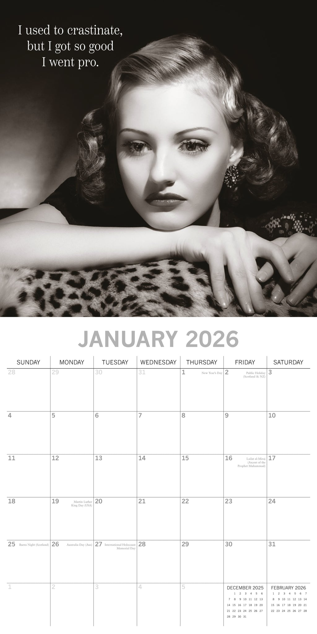 The 2026 Witty One Liners Square Wall Calendar spans 16 months—from September 2025 through December 2026—with the final four months of 2025 presented in a compact, mini-grid format. Each monthly spread begins on Sunday, with the top half showcasing a beautiful image and the bottom half featuring an easy-to-read monthly layout. The calendar comes shrink-wrapped for protection. .