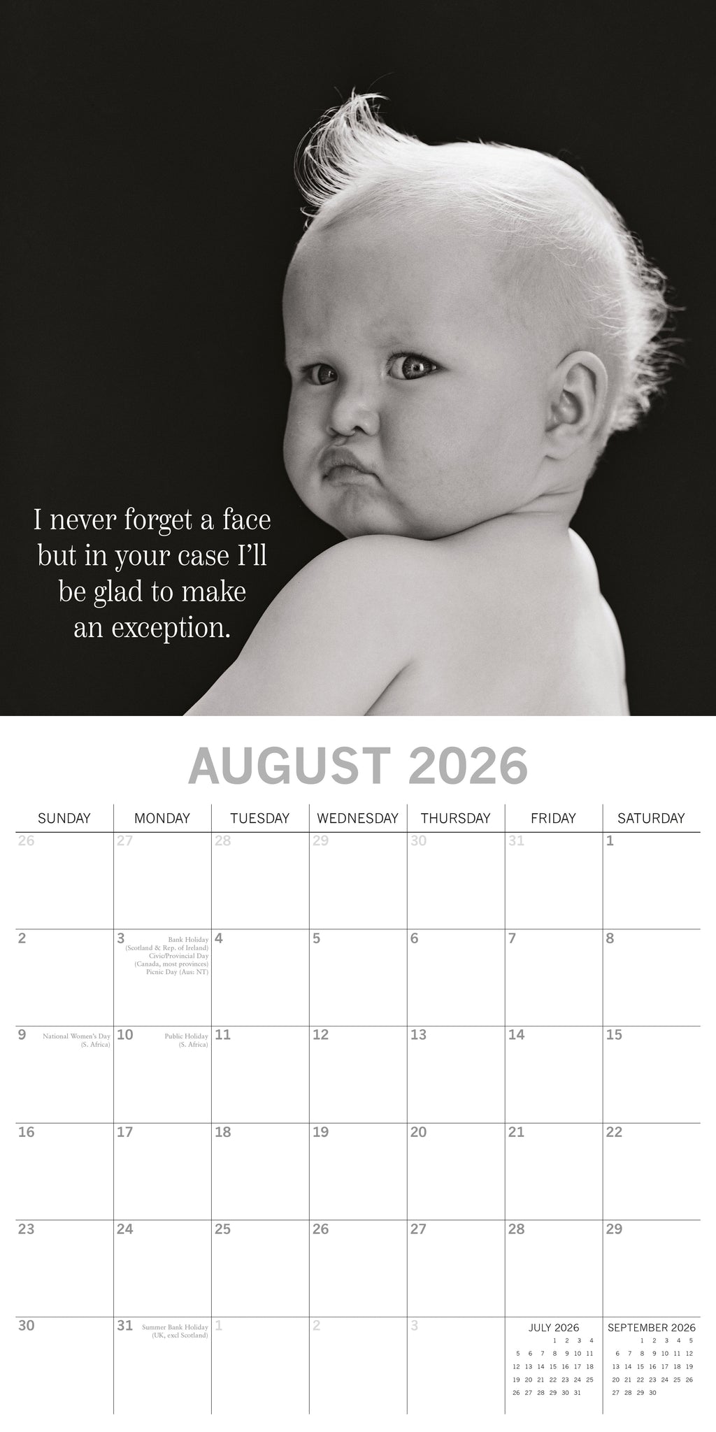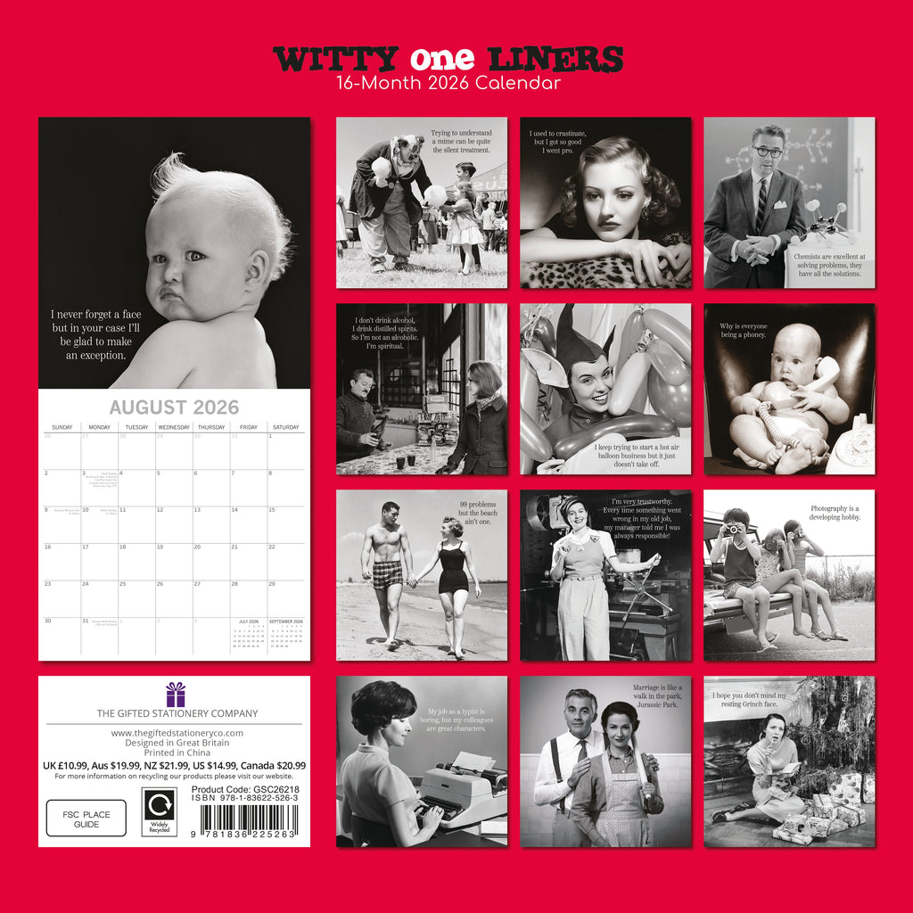 This exquisitely designed 2026 Witty One Liners Square Wall Calendar from The Gifted Stationery Co. is ideal for your home or office and makes a thoughtful holiday gift for your loved ones. It features 13 stunning images of Witty One Liners and includes large date grids for jotting down appointments, birthdays, and other important events. When opened, it measures 30 x 60 cm.
