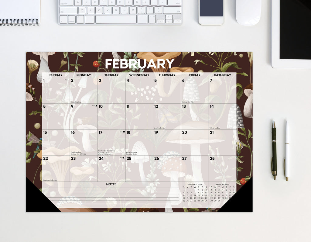Bring the enchanting beauty of nature to your workspace with this deskpad calendar, featuring whimsical woodland mushroom illustrations and plenty of space for your schedules, notes, and tasks. Perfect for jotting down important dates and notes, this deskpad is a versatile addition to your workspace.