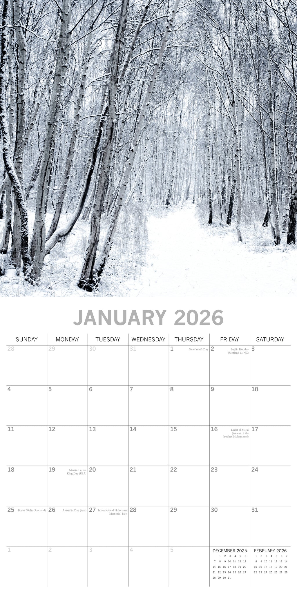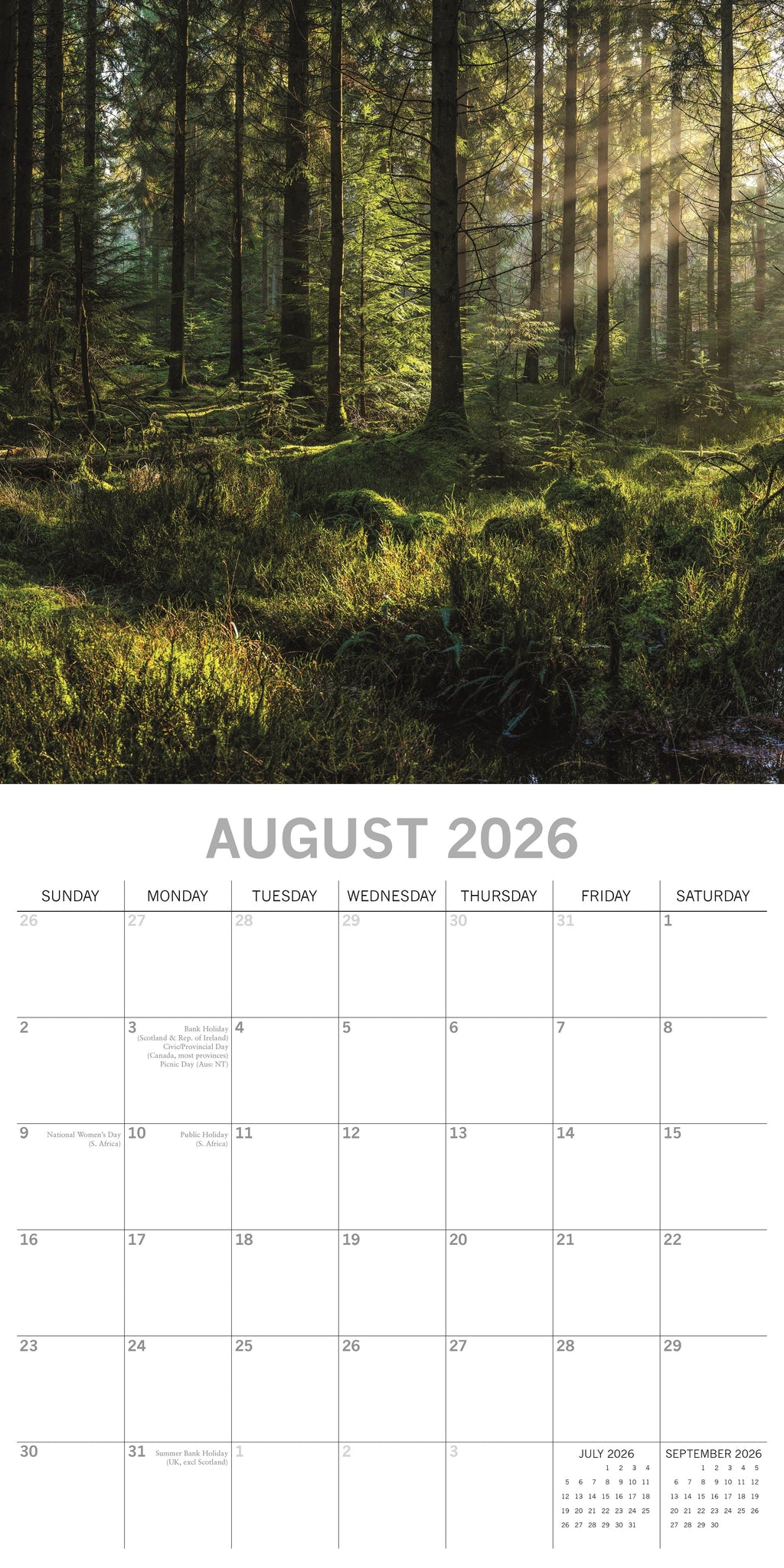 The 2026 Woodland Scenes Square Wall Calendar spans 16 months—from September 2025 through December 2026—with the final four months of 2025 presented in a compact, mini-grid format. Each monthly spread begins on Sunday, with the top half showcasing a beautiful image and the bottom half featuring an easy-to-read monthly layout. The calendar comes shrink-wrapped for protection. .