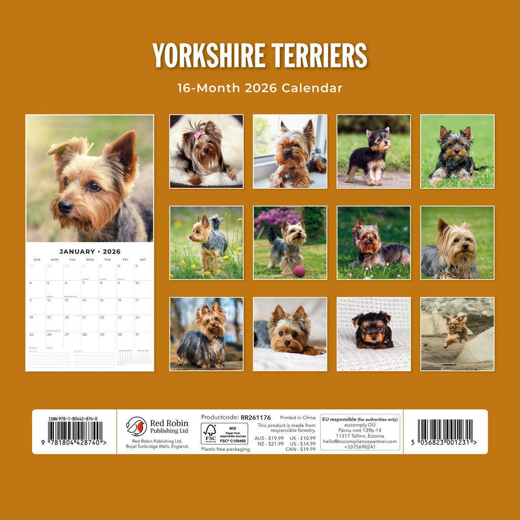Packaged in a 100% plastic-free, sustainable, FSC-certified envelope, this 2026 Yorkshire Terriers Square Wall Calendar from Red Robin Publishing Ltd includes 12 months plus 4 bonus months, providing extended planning and a full year of enjoyment. .