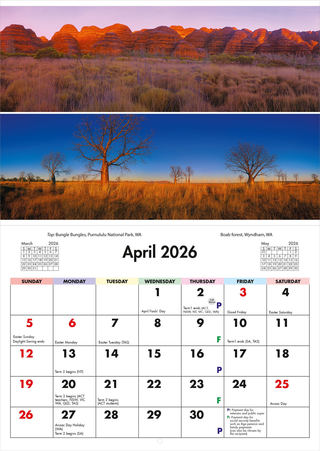 Each month 2026 Australian impressions - Horizontal Wall Calendar includes ample space to write in appointments, reminders, special events, and previous and next month views. Plus, Australian school holidays, pension days and public holidays and moon phases are included, making it a practical addition to any home, office, or classroom. .