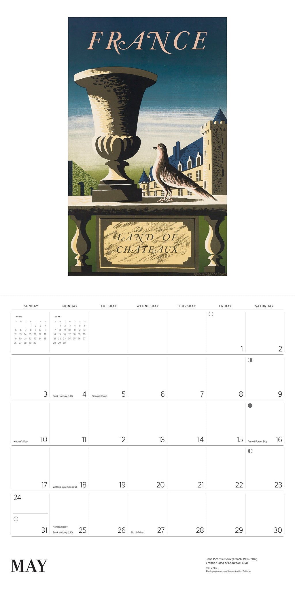 A hotbed of European art and culture, France has long attracted visitors to experience its riches. In the early 20th century, advances in transportation drew tourists there in droves. Wellknown artists such as Constant Leon Duval and Jean Picart le Doux were commissioned to create imagery highlighting destinations all across France, from the picturesque castles of the Loire Valley to the spectacle that is the tidal island of Mont Saint-Michel. The posters reproduced in this calendar capture the joie de vivre of a trip through the French countryside. .