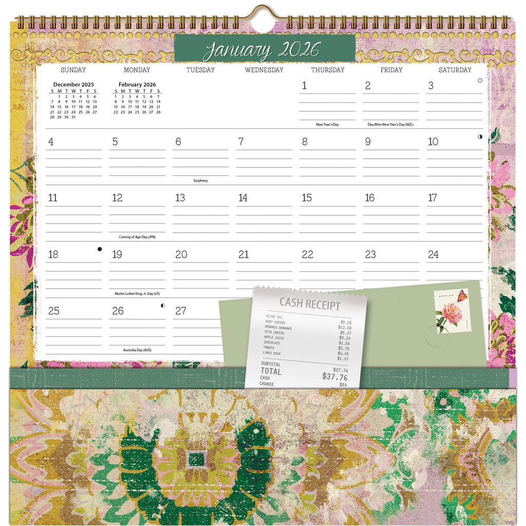 Stay on top of your schedule and organized in style with the 2026 Patina Vie Note Nook Calendar by LANG. This clever 12-month wall calendar combines beautiful themed artwork with smart functionality, featuring two deep storage pockets every month to keep track of bills, receipts, coupons, appointment cards, and moreall in one tidy place.