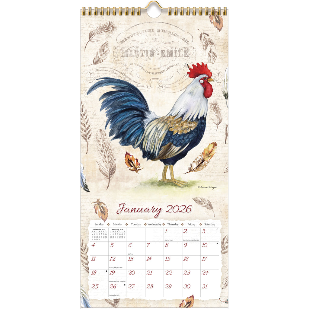 The 2026 LANG Proud Rooster Slim Vertical Wall Calendar brings bold barnyard charm to compact spaces with its vibrant rooster illustrations and rustic flair. Each month highlights a proud, colorful rooster surrounded by floral accents, rich textures, and country-inspired patternsmaking it a cheerful addition to any room.