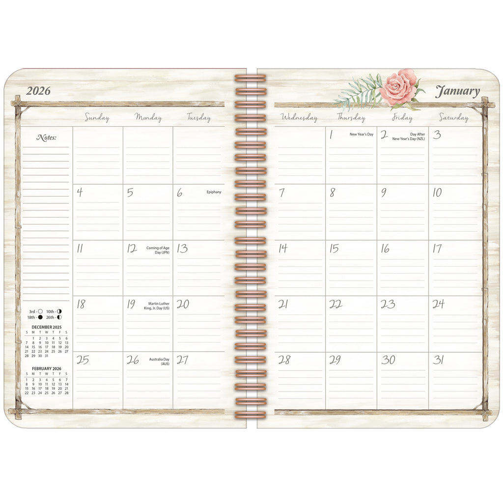 Stay beautifully organized all year with the 2026 Rosewood Ranch Spiral Engagement Diary Planner from LANG. This elegant planner combines weekly and monthly views in one thoughtfully designed format, making it easy to track appointments, goals, and to-dos with both a big-picture and day-to-day perspective.