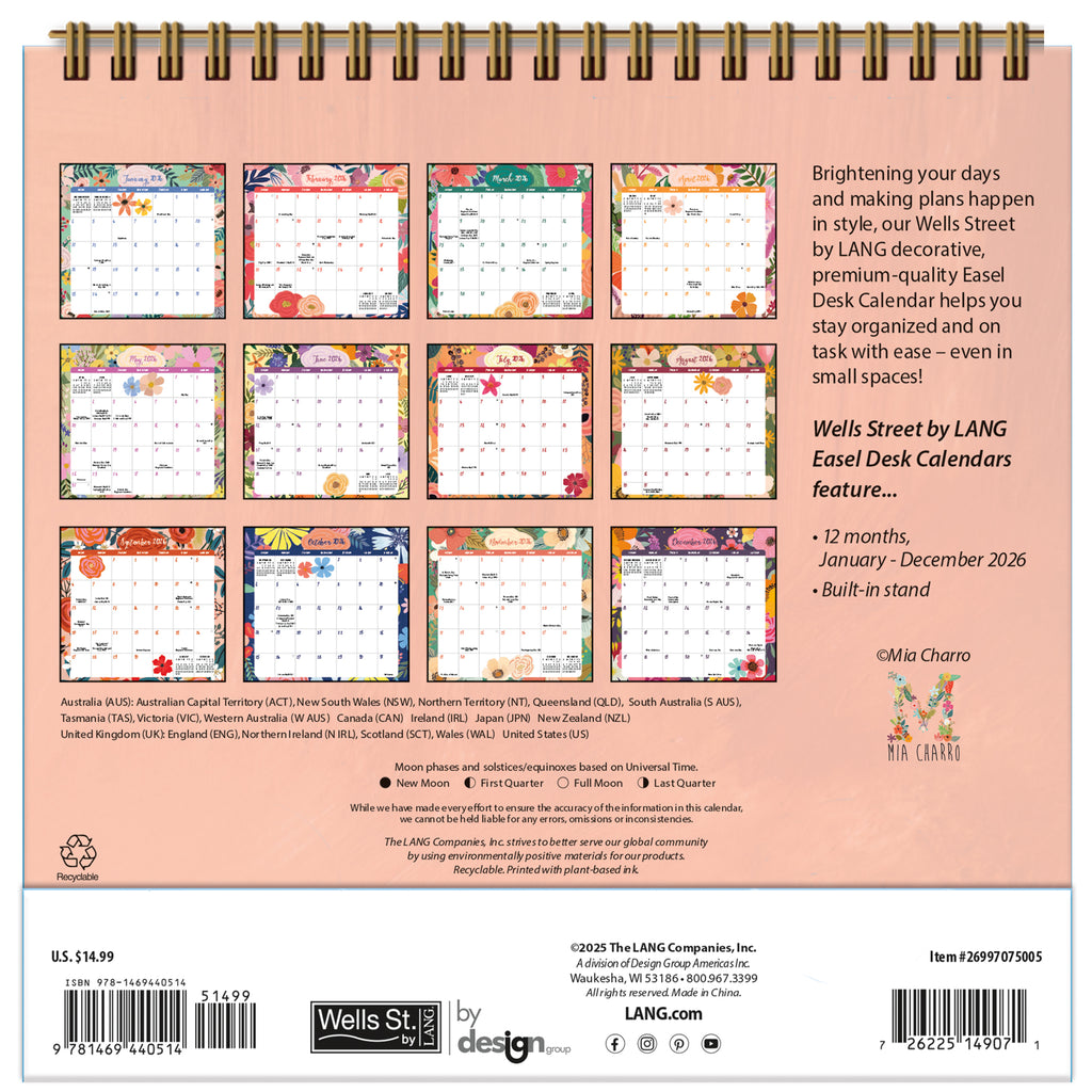 Add charm and function to your desk with the 2026 Shine Within Desk Easel Calendar by LANG. This compact calendar features a freestanding easel design, perfect for small spaces like desktops, shelves, or countertops. Each month showcases unique themed artwork paired with a simple monthly grid that starts on Sunday, offering just enough space to jot down key dates and reminders.