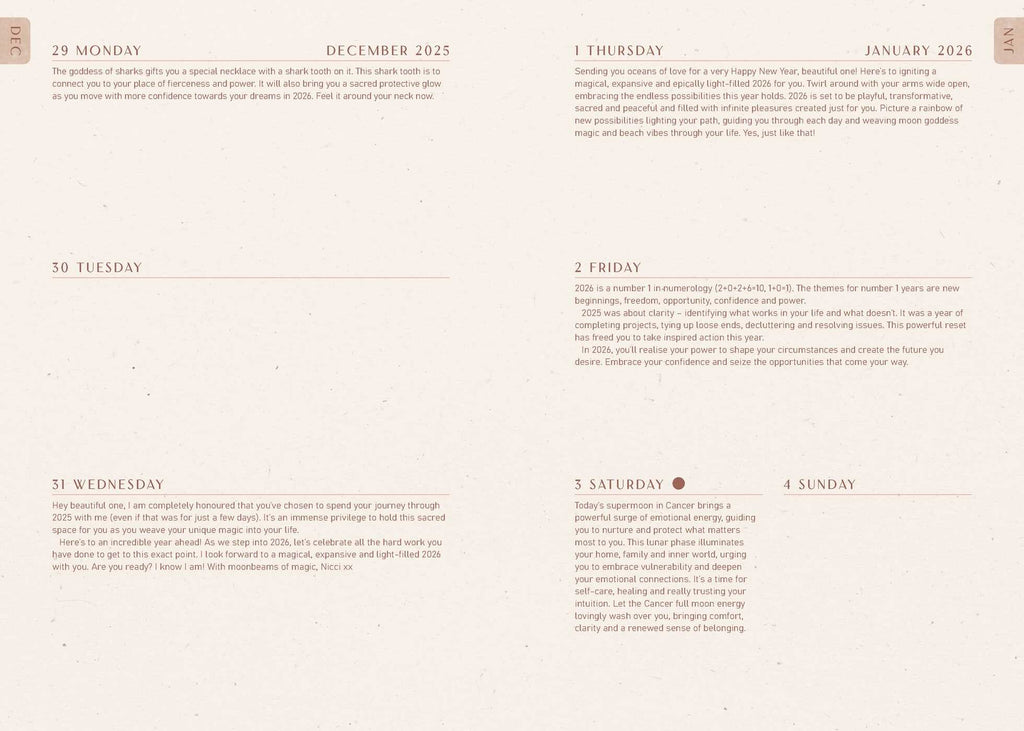 Embark on a year-long journey of love, connection, and self-discovery. This illustrated, full-colour diary is crafted with such care and affection that its wisdom will effortlessly flow into your life. Learn to harness the energy of the moon, the seasons, and sacred celebrations. With insights on using crystals, essential oils, affirmations, rituals, and songs, youll tap into your inner goddess. .