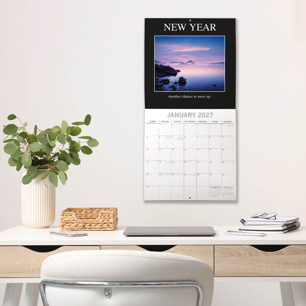 The 2027 Demotivation Square Wall Calendar spans 16 months—from September 2026 through December 2027—with the final four months of 2026 presented in a compact, mini-grid format. Each monthly spread begins on Sunday, with the top half showcasing a beautiful image and the bottom half featuring an easy-to-read monthly layout. The calendar comes shrink-wrapped for protection.