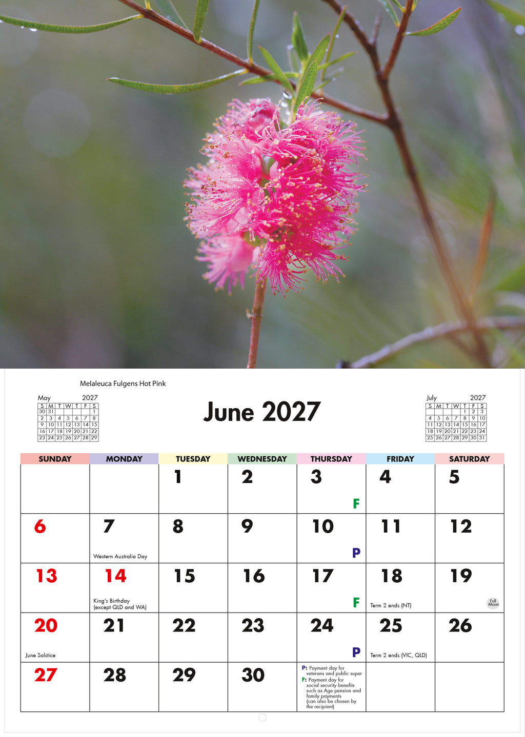 Each month in the 2027 Flora Of Australia - Horizontal Wall Calendar includes ample space to write in appointments, reminders and special events, plus previous and next month views. Australian school holidays, pension days, public holidays and moon phases are also included, making it a practical addition to any home, office or classroom.